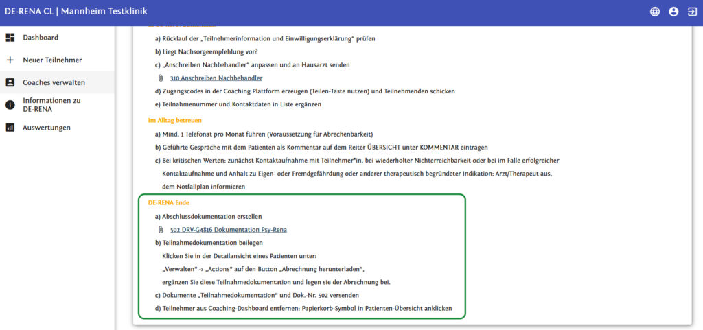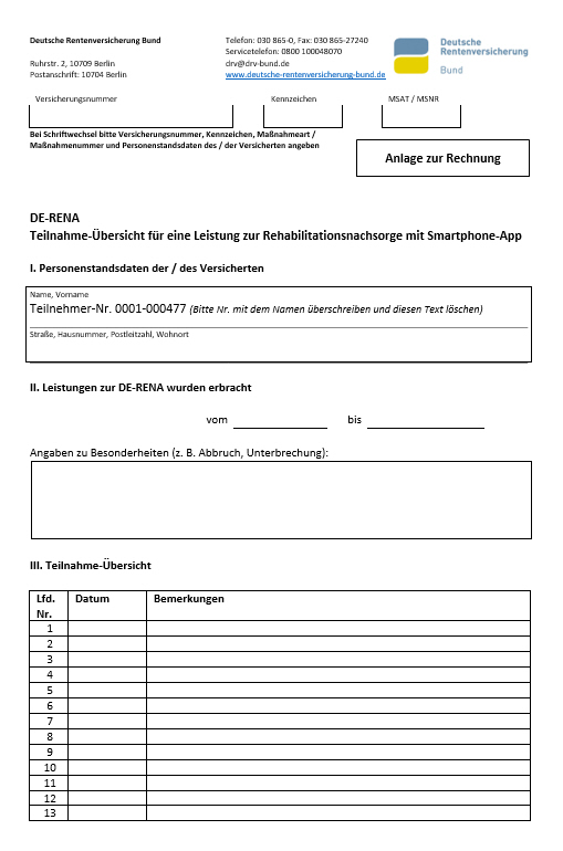 Die Durchführung der Reha-Nachsorge mit DE-RENA ist mit einer Auflistung der in Anspruch genommenen Leistungen (Gesprächseinheiten) nach Datum zu dokumentieren.