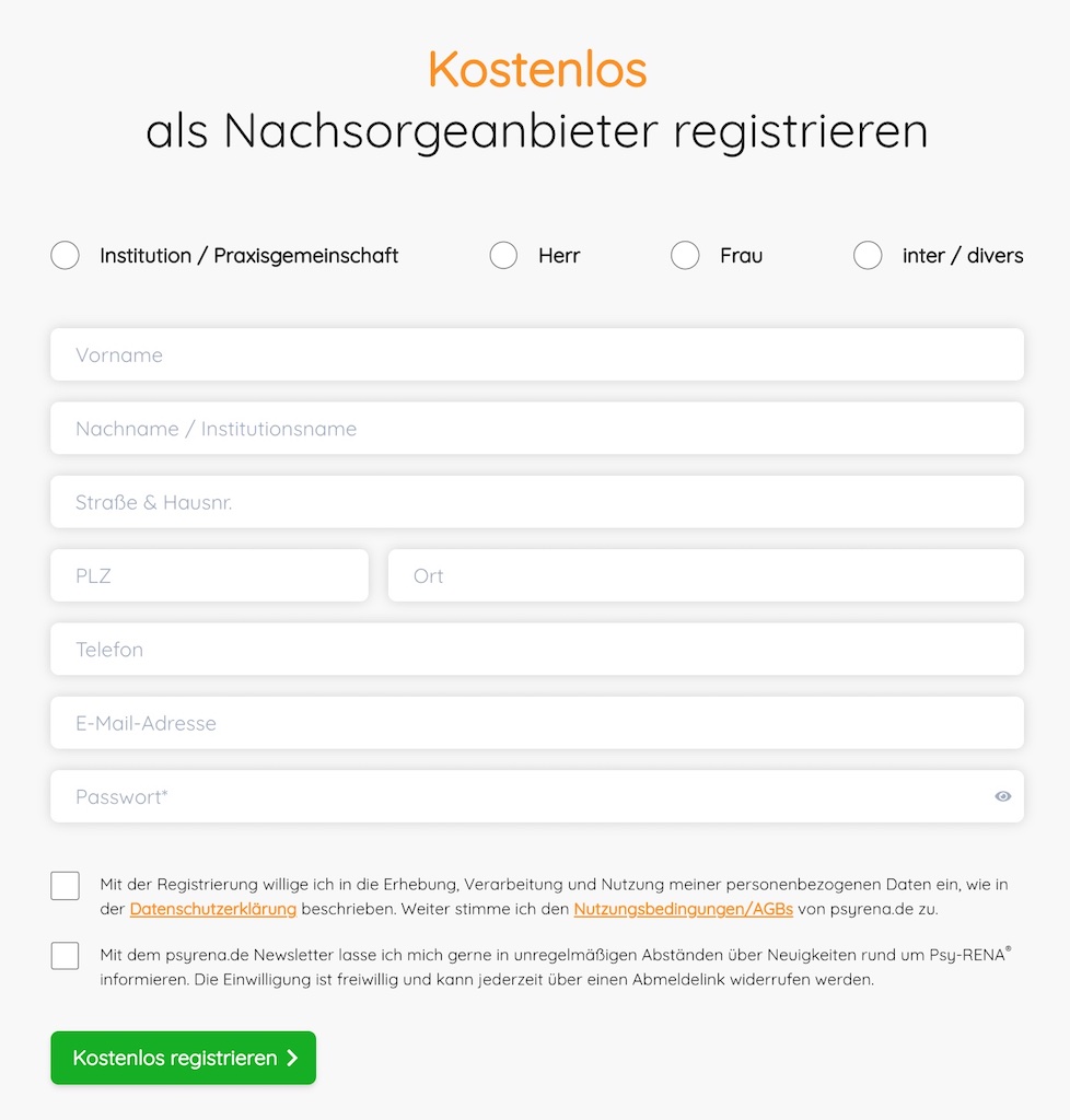 Schritt-für-Schritt Anleitung zur kostenlosen Registrierung als Nachsorgeanbieter auf der Plattform psyrena.de: